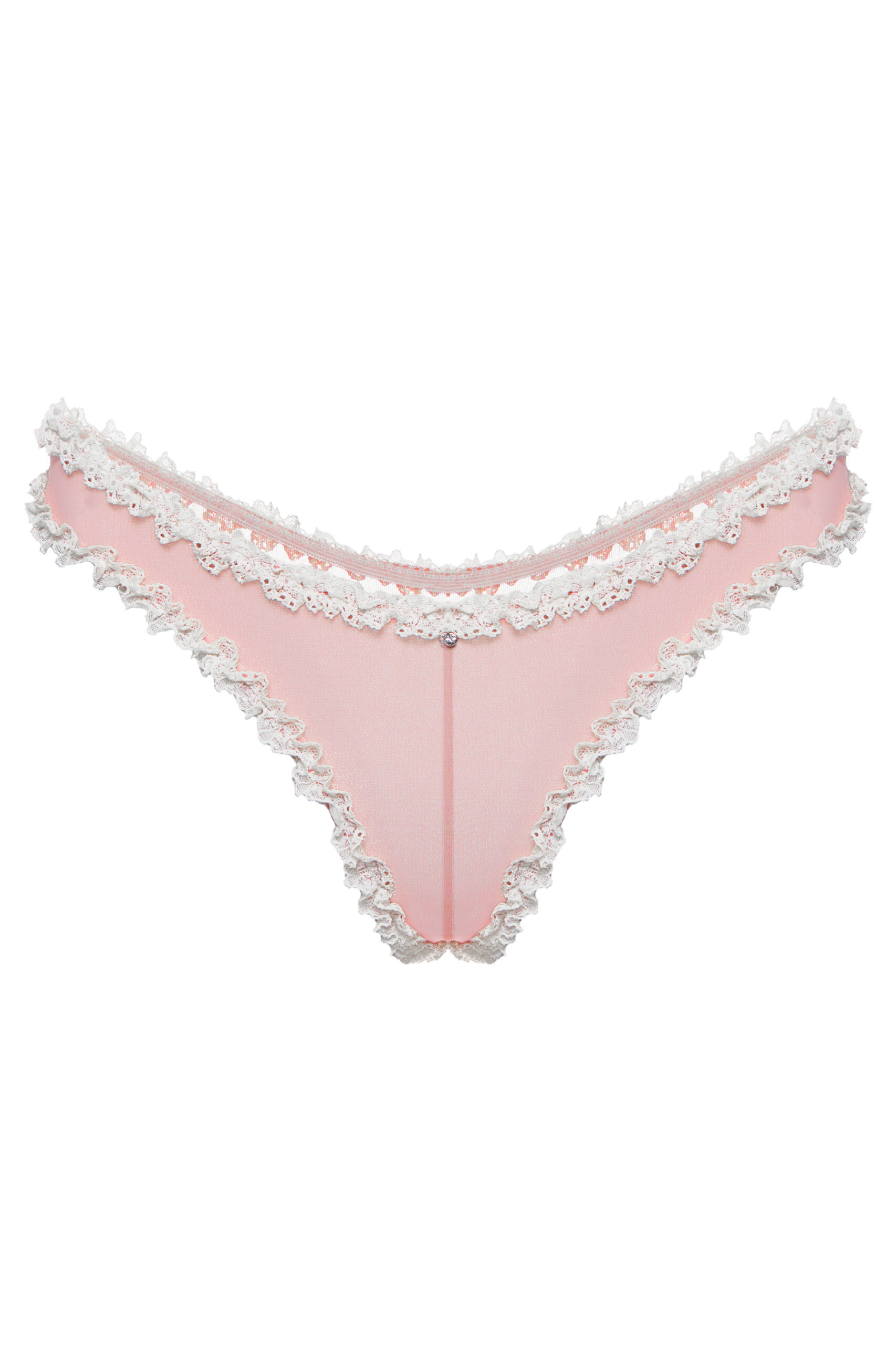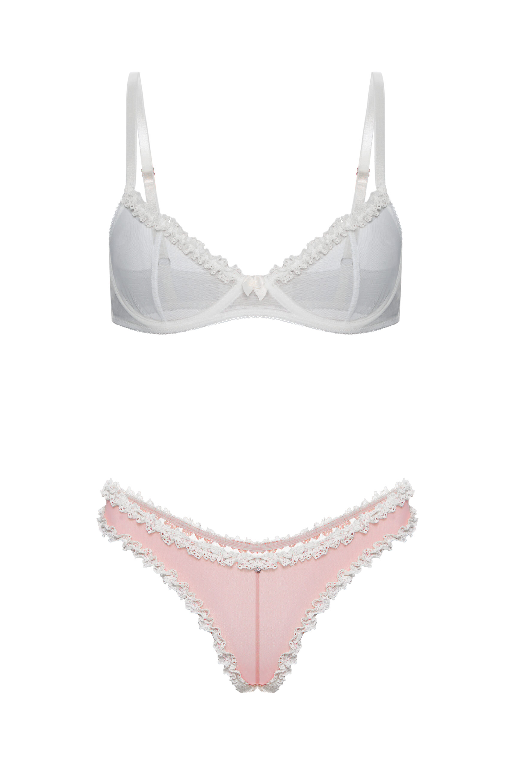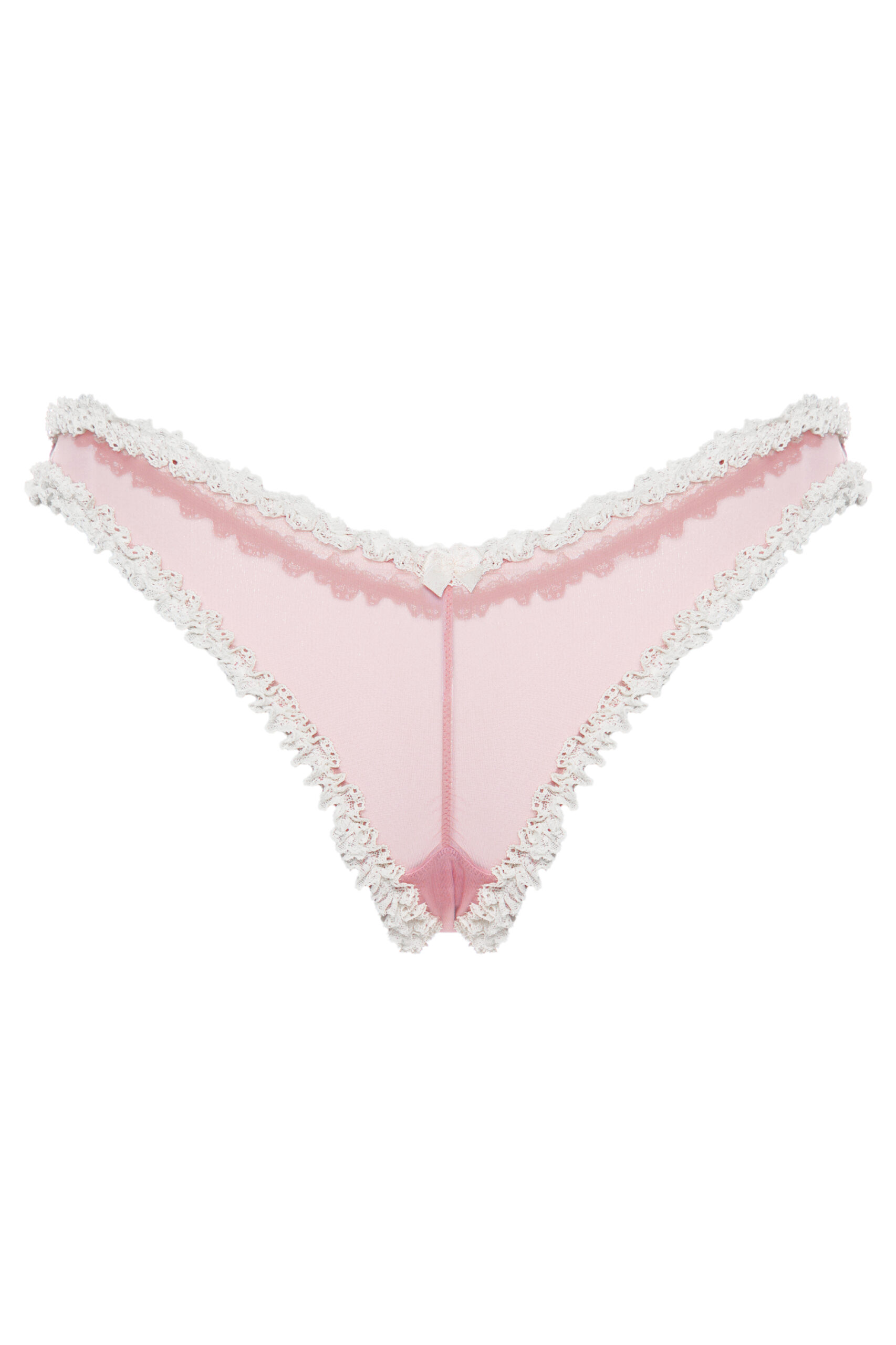 Трусики виконані з м’якої еластичної сіточки та мережива і прикрашені деталями з атласної стрічки. Колір: пудрово-рожевий, молочний. Склад: поліамід – 70%, еластан – 20%, бавовна – 10%.На моделі: розмір XS. Параметри: 86-60-88. Зріст: 165.