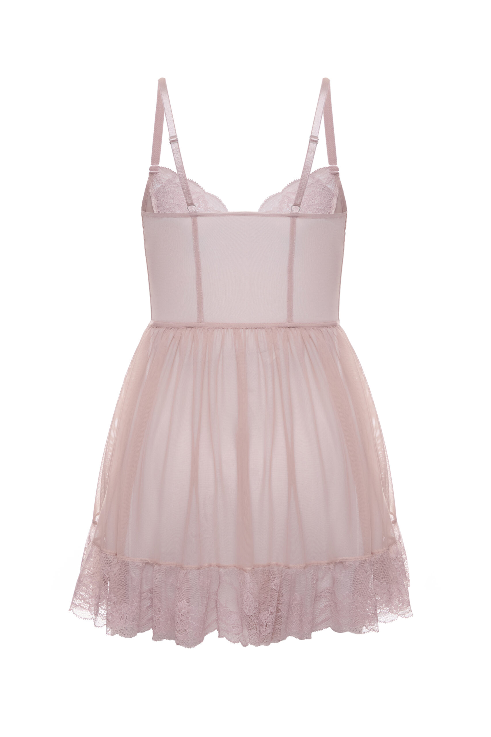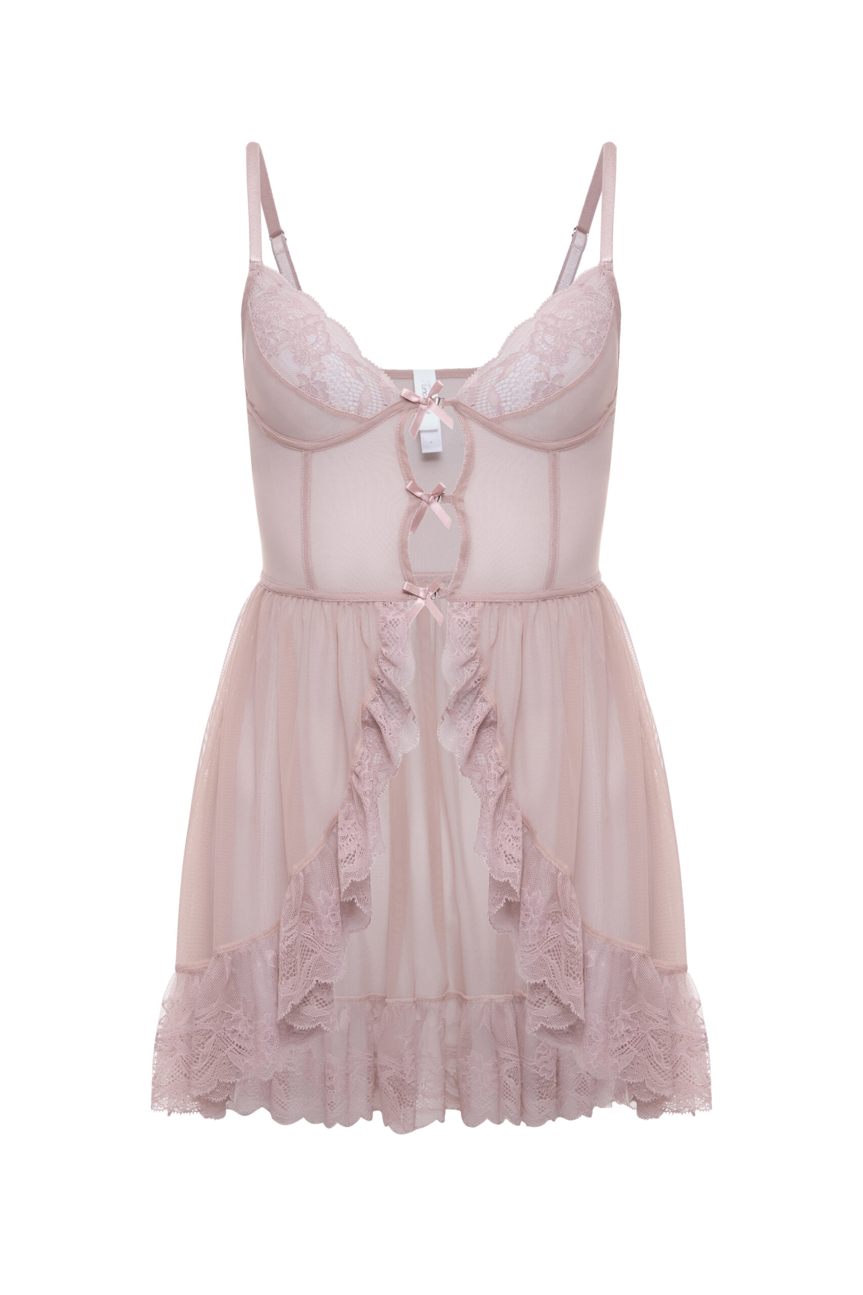 Сукня виконана з м’якої еластичної сіточки та мережива та прикрашені деталями з атласної стрічки. Колір: бежевий. Вміст: поліамід – 80%, еластан – 20%. Ручне прання в холодній воді. На моделі розмір XS. Параметри: 86-60-88. Зріст: 165.