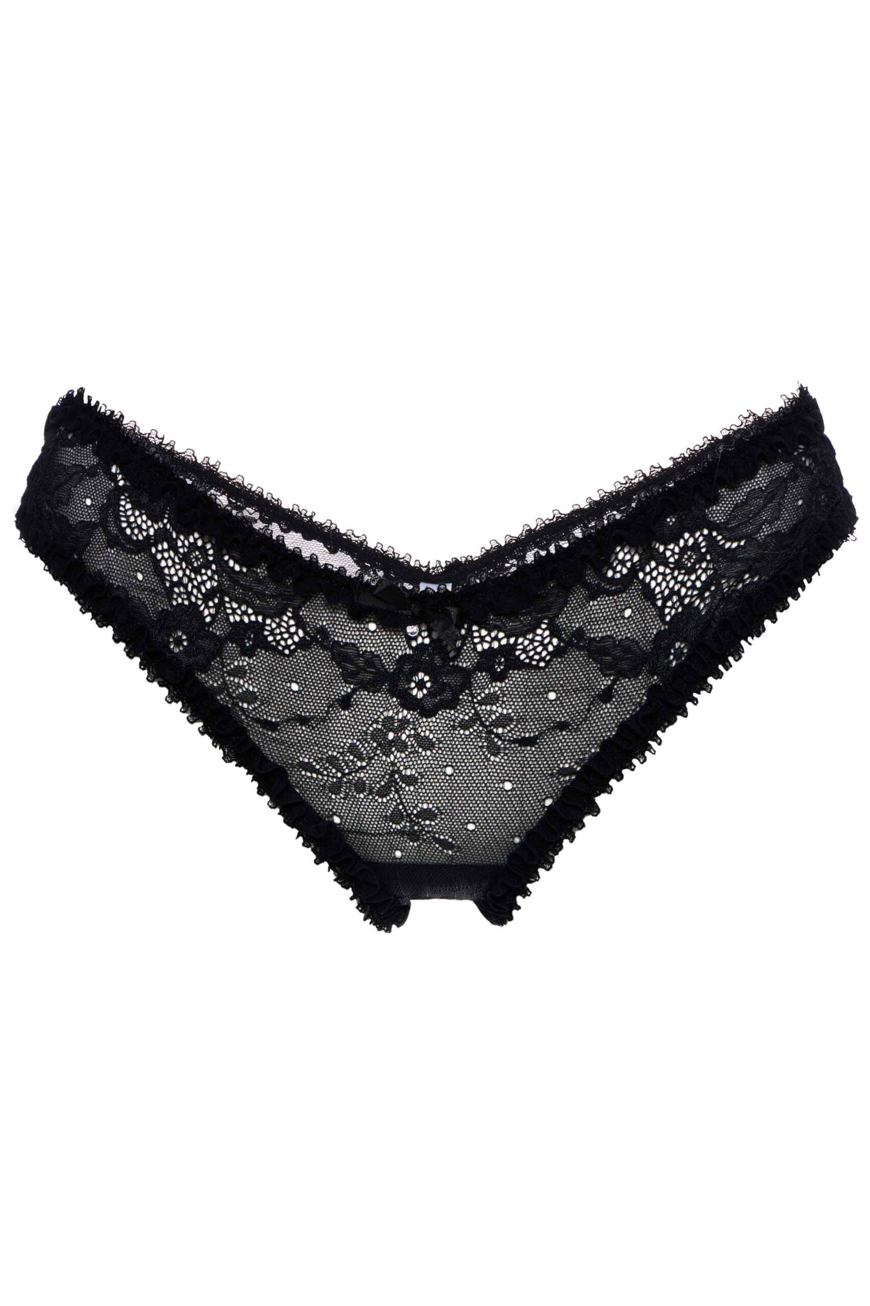 Трусики виконані з м’якого еластичного мережива, прикрашені деталями з атласної стрічки. Колір: чорний. Склад: поліамід – 70%, еластан – 20%, бавовна – 10%. Ручне прання в холодній воді.